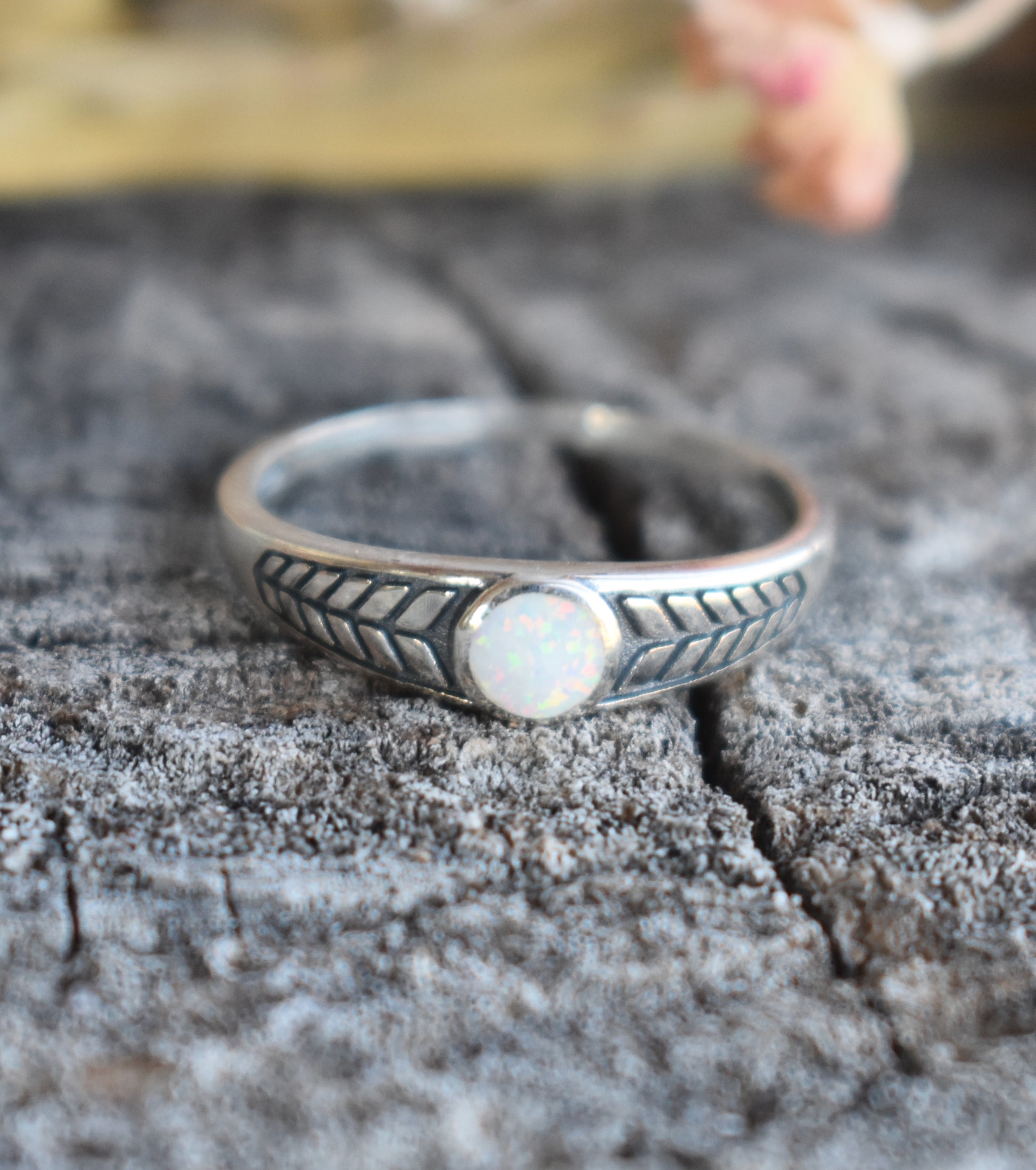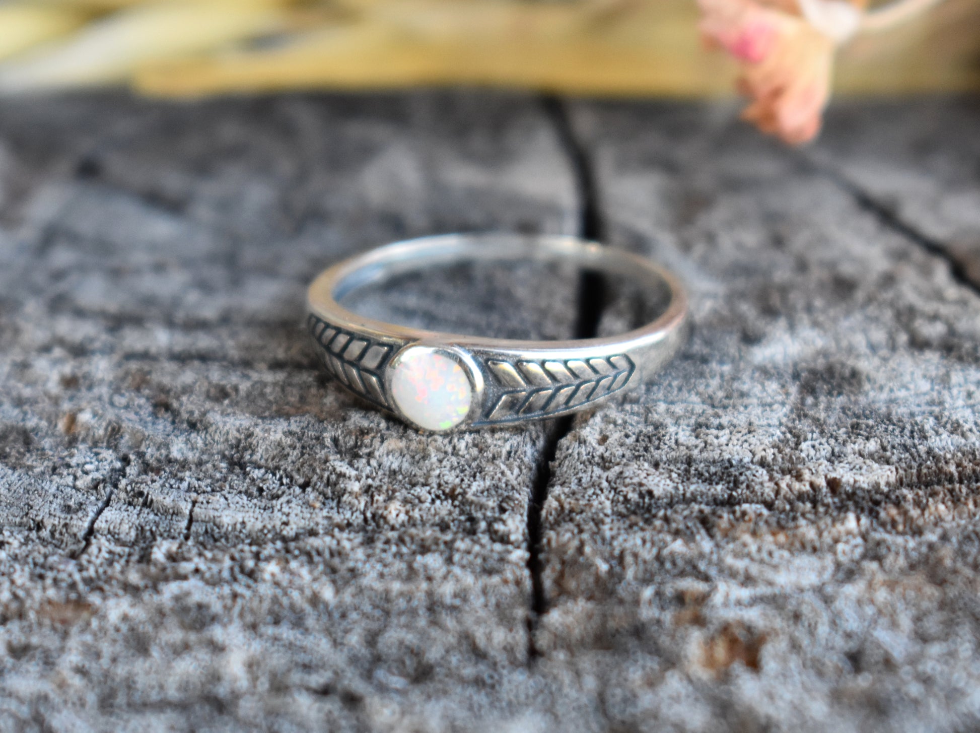 - 5mm Opal, tapers to 2mm width ring band in back.