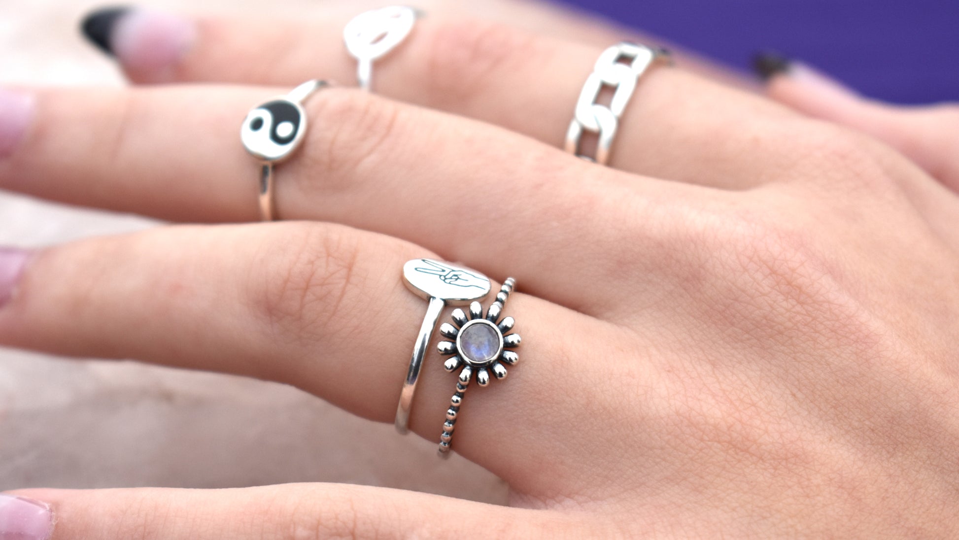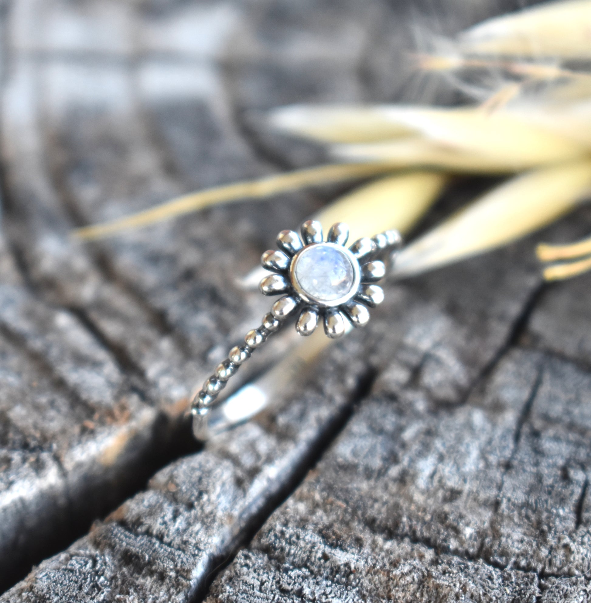 -5mm Rainbow Moonstone, 9mm full flower on a 2mm half bead/half smooth ring band