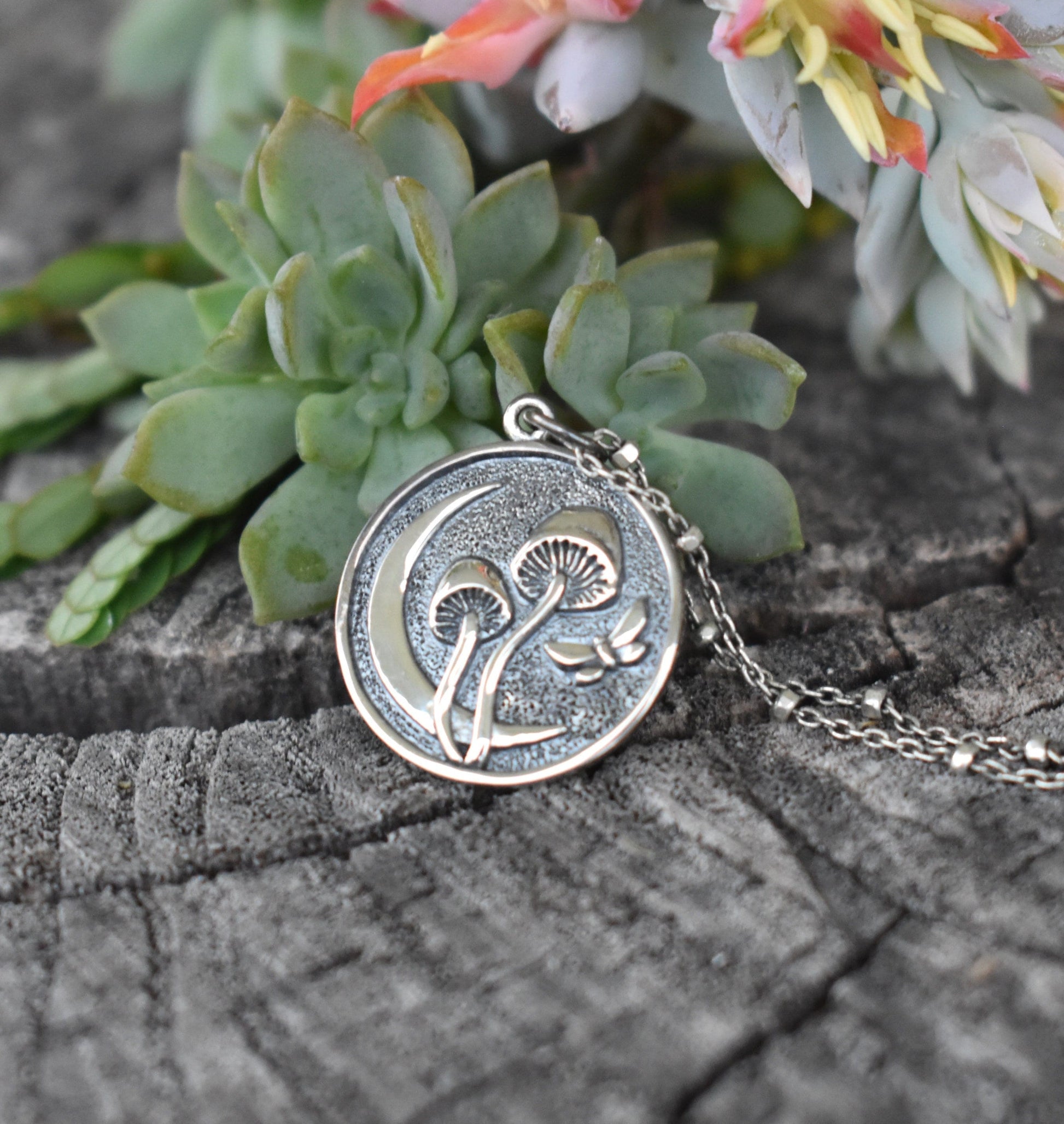Crescent Moon & Mushroom Necklace details: