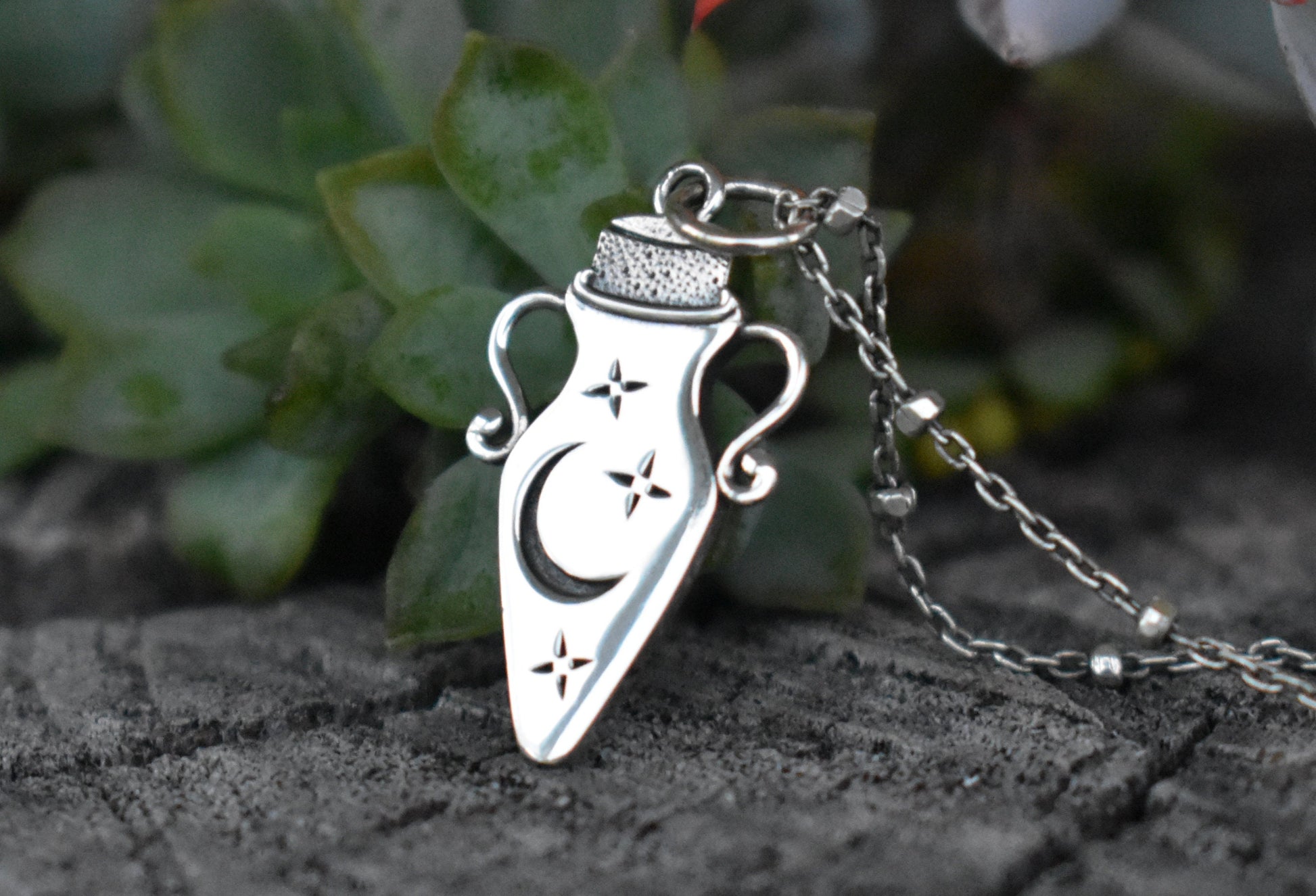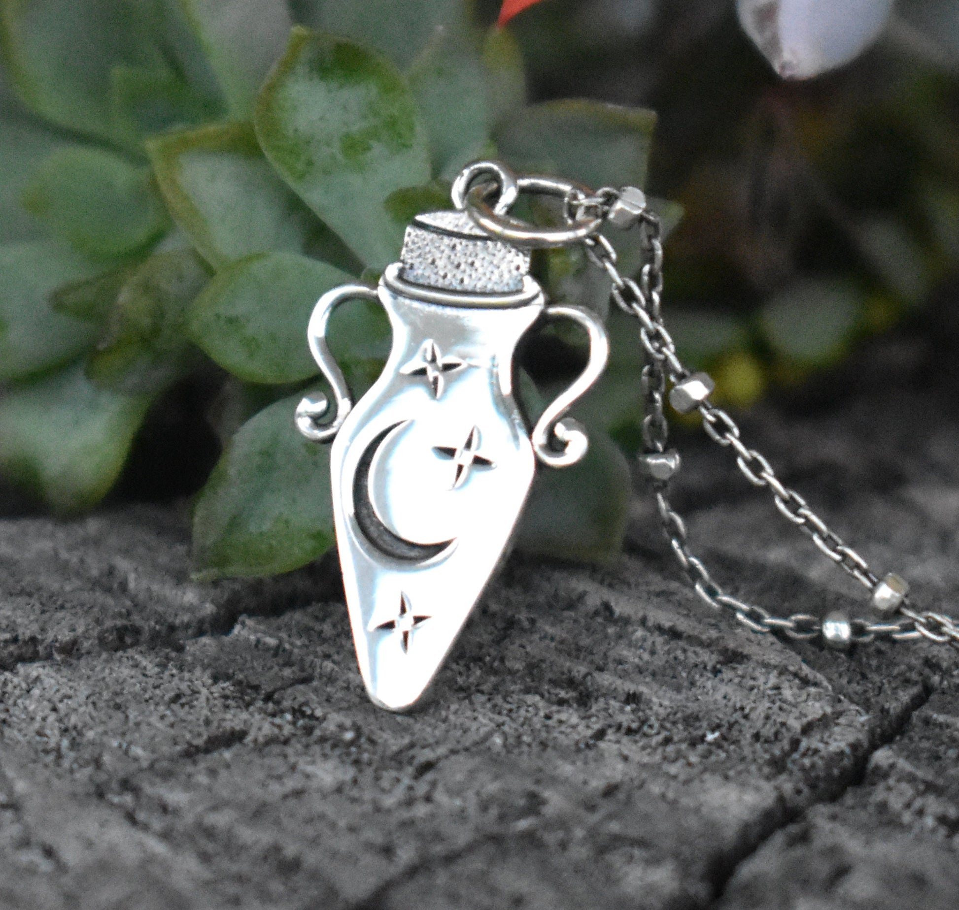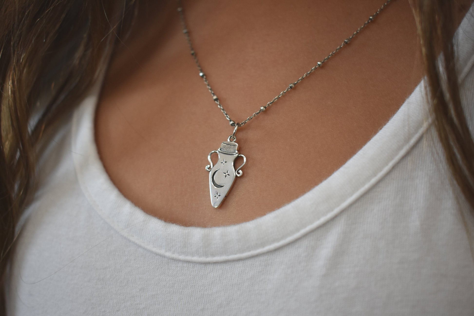 Potion Necklace- Potion Bottle, Witches Brew, Moon And Star Necklace-Silver Necklace