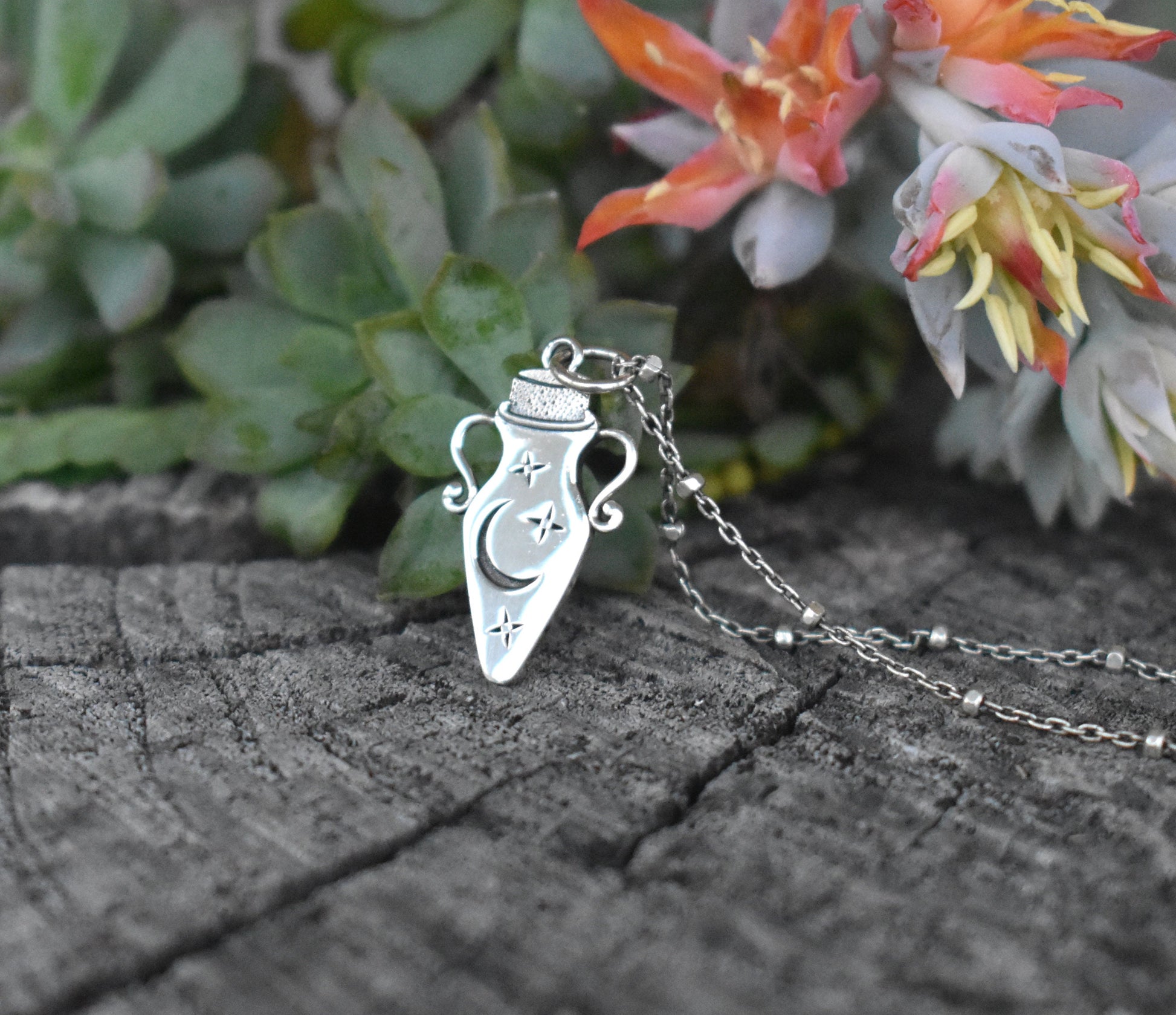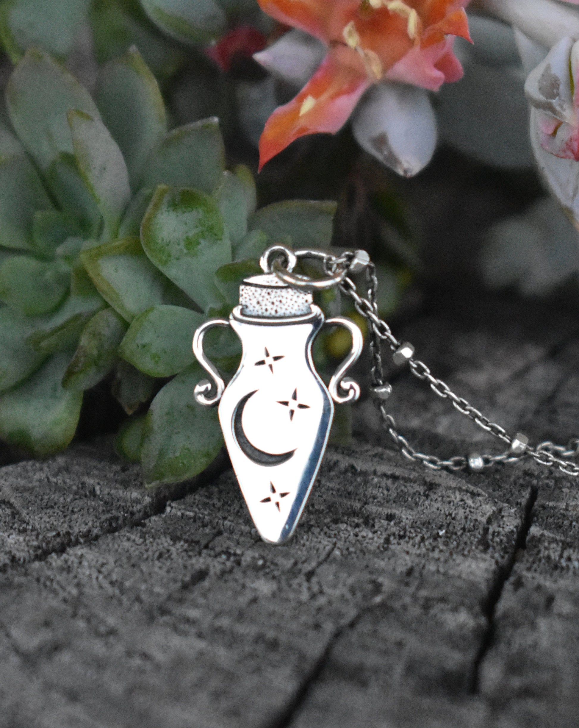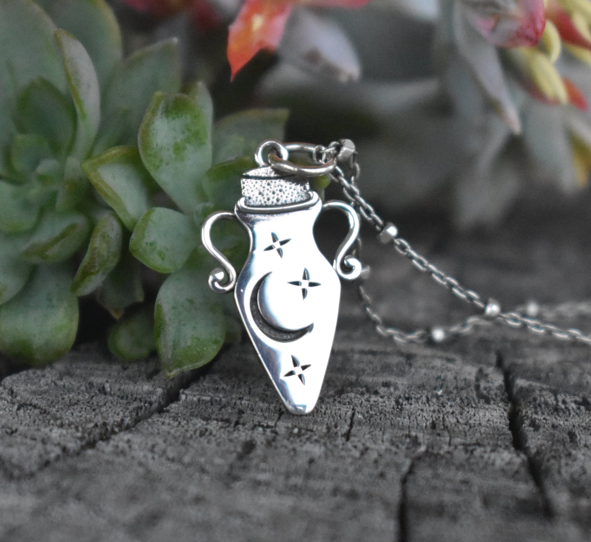Potion Necklace- Potion Bottle, Witches Brew, Moon And Star Necklace-Silver Necklace